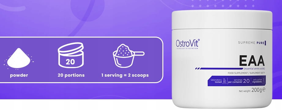 Kompleks OstroVit Supreme Pure EAA dzięki aminokwasom białkowym wspierają regenerację oraz procesy anaboliczne naszych komórek mięśniowych.