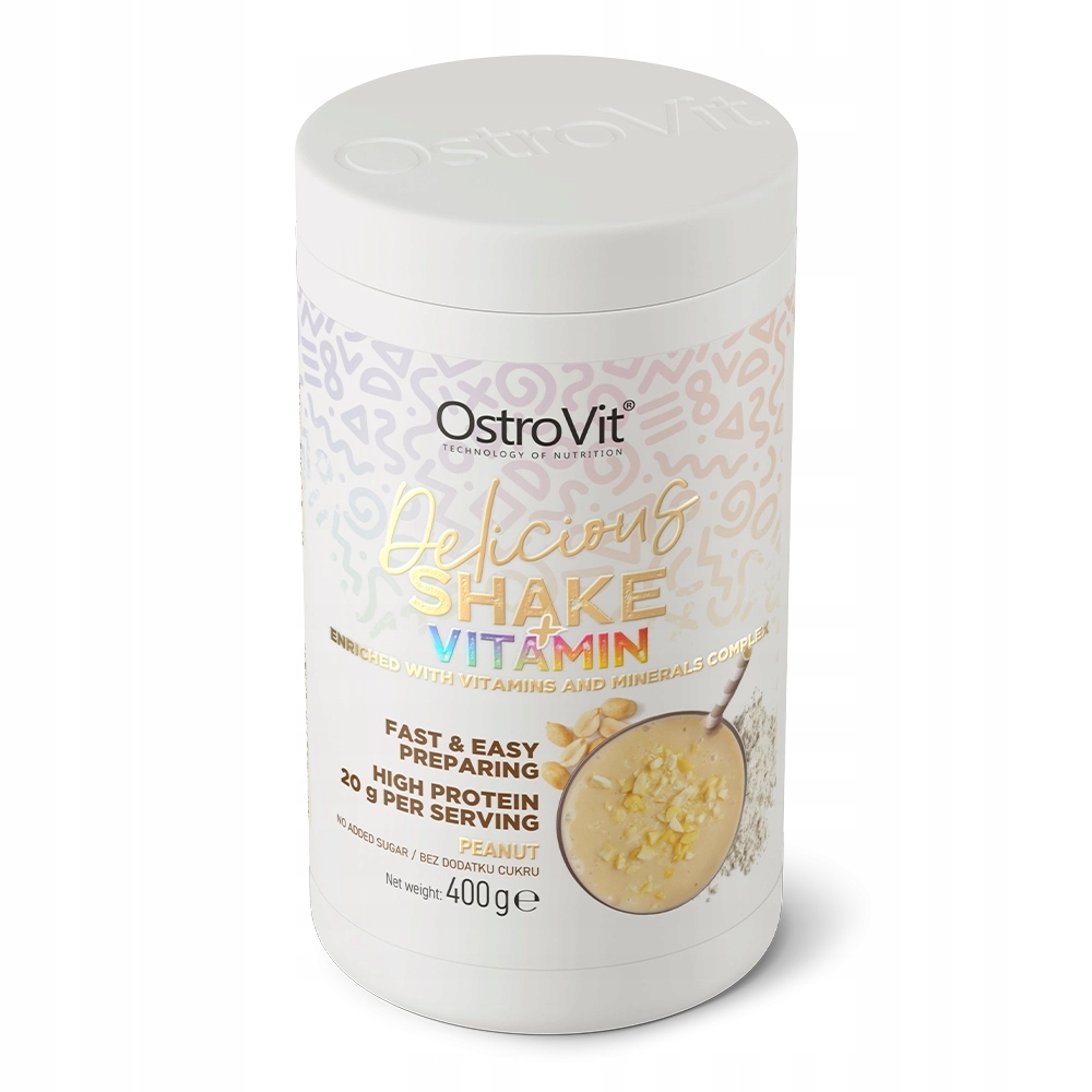 - OstroVit Delicious Shake + Vitamin to wysokobiałkowa mieszanka do przygotowania shake’a, która zawiera kompleks witamin i składników mineralnych.
