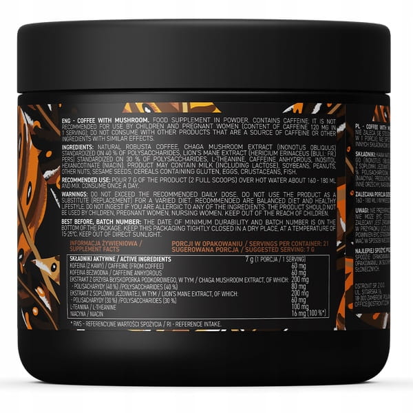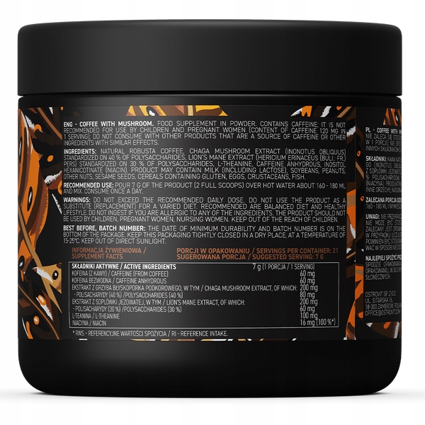Składniki: Kawa naturalna robusta, ekstrakt z grzyba błyskoporka podkorowego (Inonotus obliquus) standaryzowany na 40% polisacharydów, ekstrakt z soplówki jeżowatej (Hericium erinaceus (BulI.: Fr.) Pers) standaryzowany na 30 % polisacharydów, L-teanina, kofeina bezwodna, heksanikotynian inozytolu (niacyna).