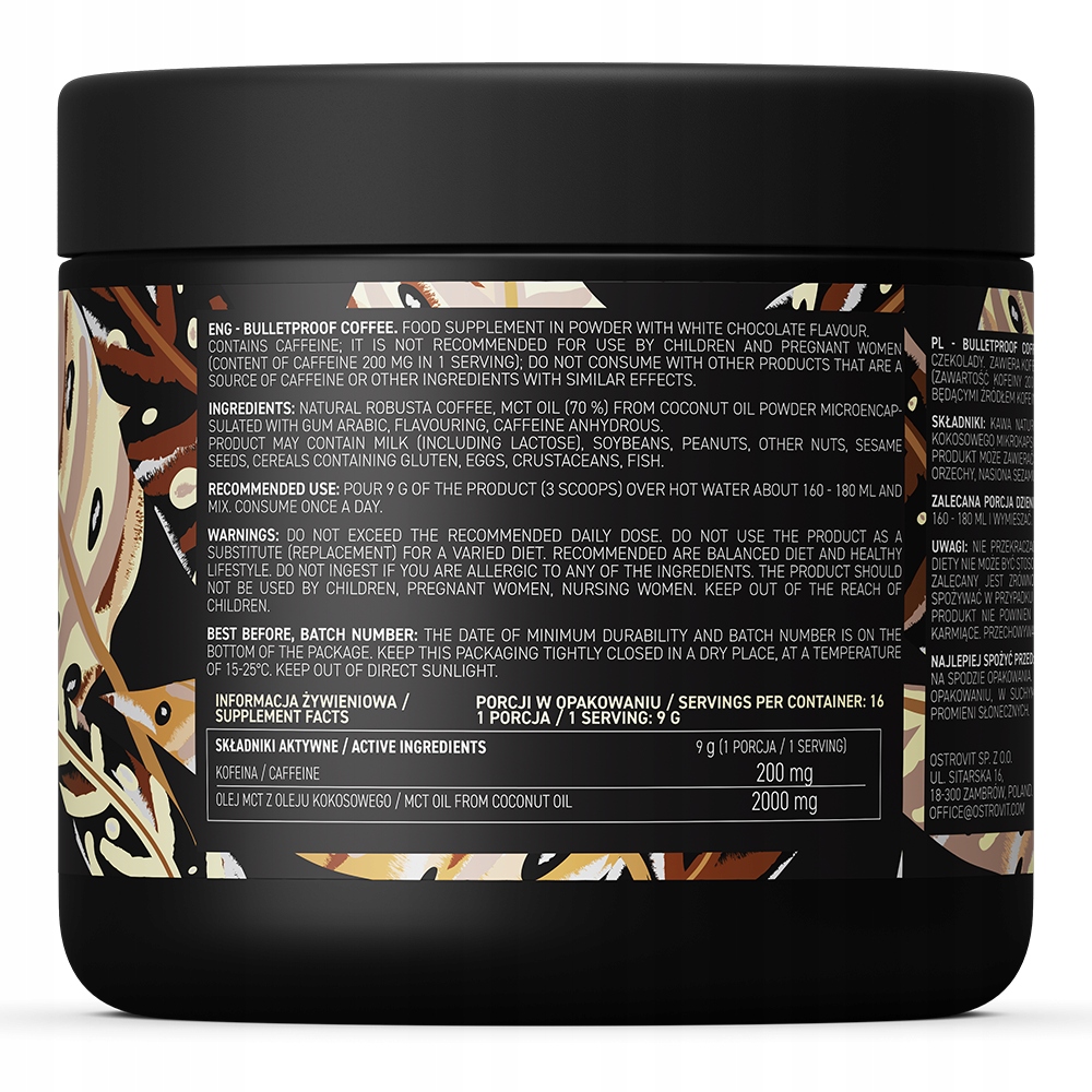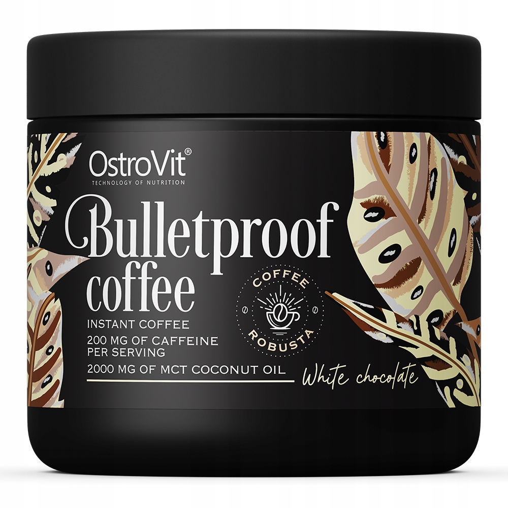 OstroVit Bulletproof coffee 150 g to kawa rozpuszczalna o smaku białej czekolady, ze zwiększoną zawartością kofeiny i z dodatkiem oleju MCT z kokosa. Doskonale komponuje się z dodatkiem mleka oraz cukru lub słodzika, które można dodać według własnych preferencji. Jeśli zatem jesteś miłośnikiem kawy i poszukujesz aromatycznej alternatywy do codziennej porannej filiżanki tego napoju, sięgnij po OstroVit Bulletproof coffee i ciesz się jej wyjątkowym smakiem oraz aromatem!