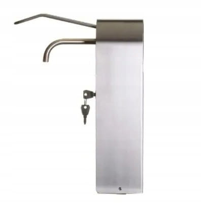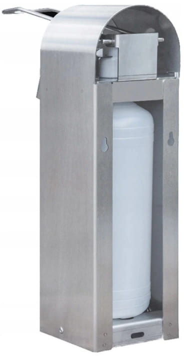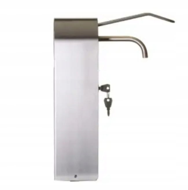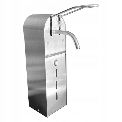 Dozownik na mydło w płynie lub na płyn do dezynfekcji w obudowie ze stali nierdzewnej, łokciowy. Wykończenie powierzchni matowe.