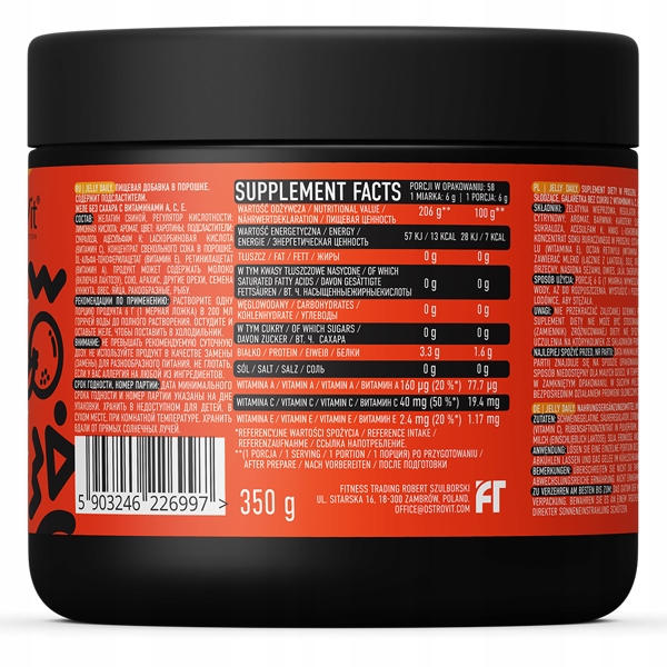 Porcję 6 g (1 miarka) wymieszać w 200 ml gorącej wody, aż do rozpuszczenia. Wystudzić i pozostawić galaretkę w lodówce, aby stężała.