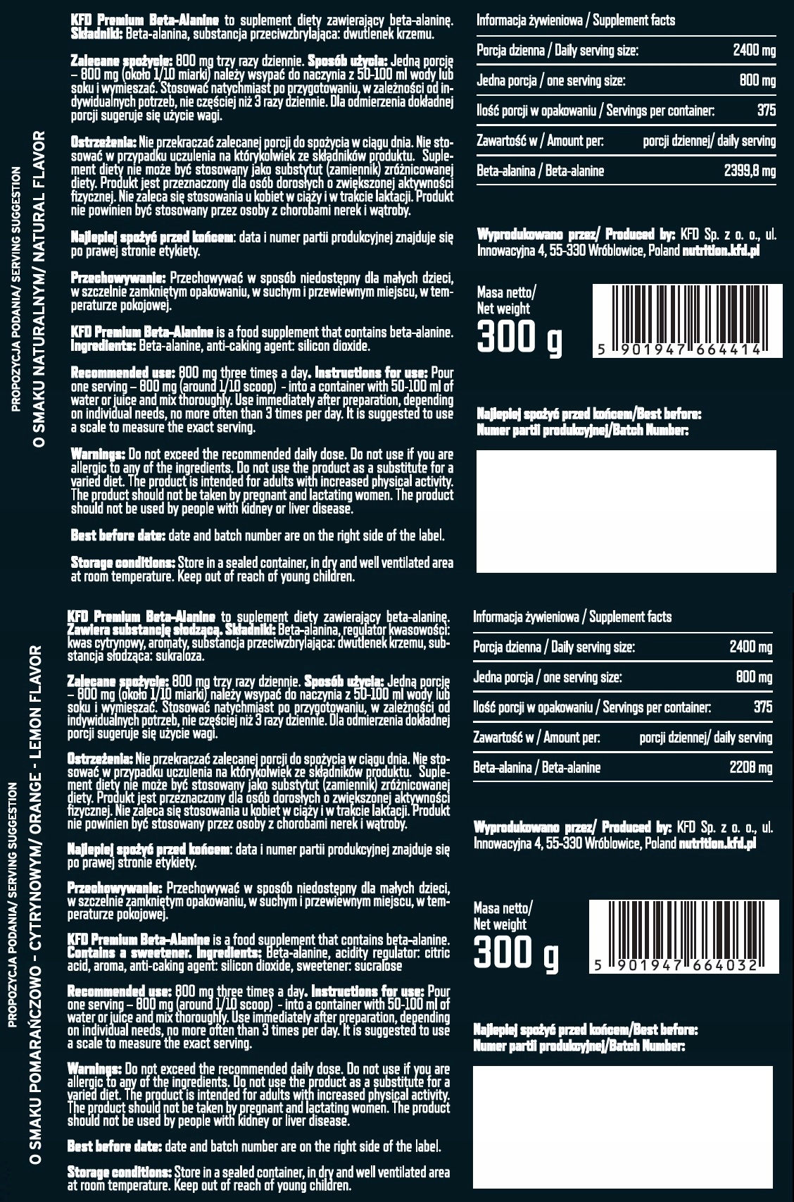 KFD Premium Beta-Alanine to czysta beta-alanina będąca związkiem stanowiącym budulec karnozyny - dipeptydu gromadzonego w mięśniach. Karnozyna posiada właściwości antyoksydacyjne (obniża toksyczność reaktywnych form tlenu) i chelatujące (zmniejsza toksyczność jonów metali).