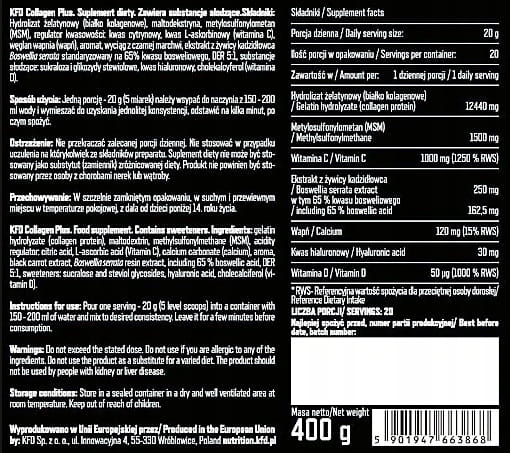 KFD Premium Collagen+ to jeden z najważniejszych produktów firmy KFD. Przez wiele osób uważany za najlepszy i najsilniejszy dostępny na rynku suplement diety, stworzony z myślą o osobach z dolegliwościami stawów, struktur okołostawowych (więzadeł, torebek stawowych, chrząstek, ścięgien, kości) lub profilaktycznie dbających o stan stawów, skóry, włosów i paznokci. Wielu klientów wspomina że działanie tego produktu jest odczuwalne już po 1-2 dniach stosowania (zaleta ekstraktu z kadzidłowca).