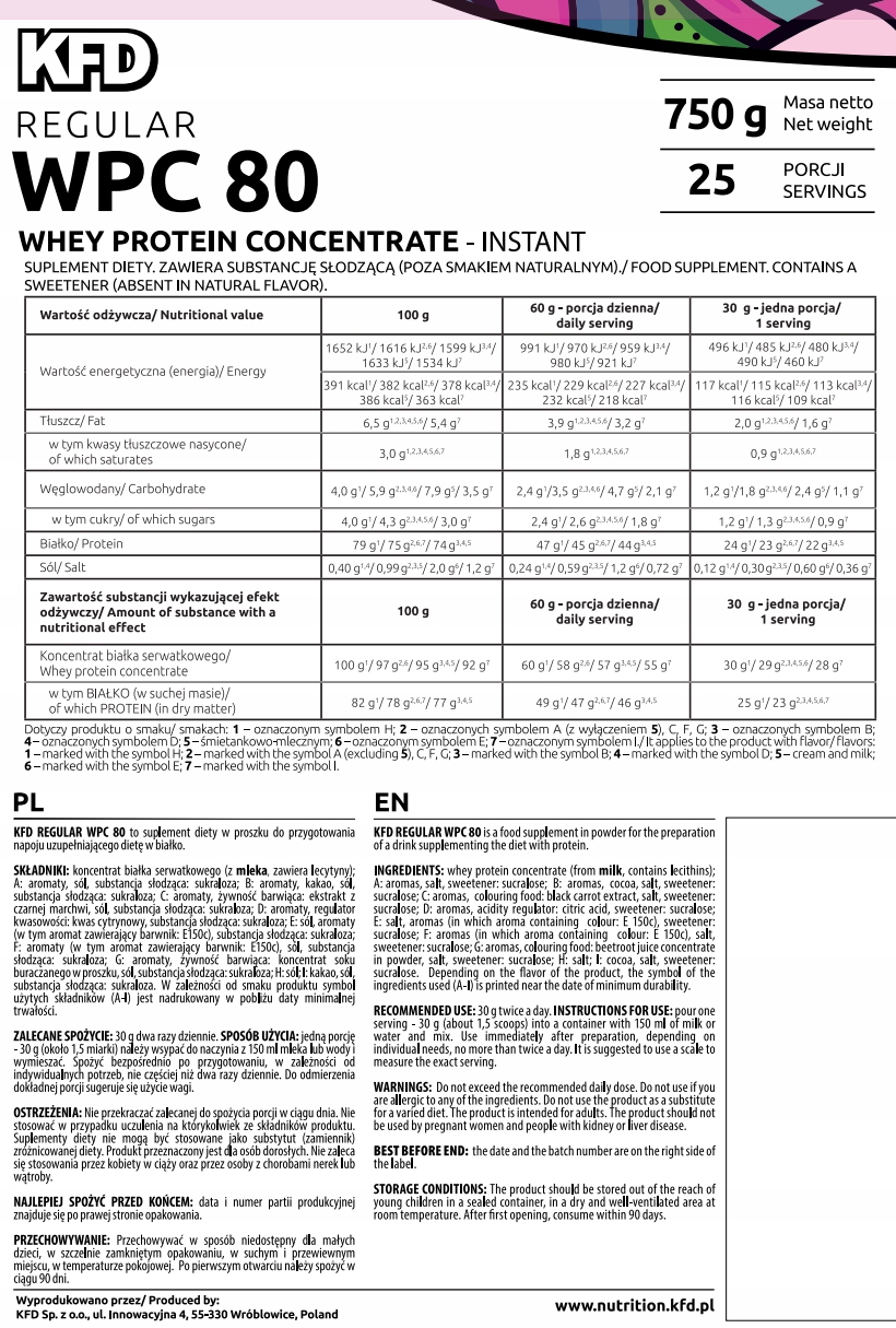 KFD Regular WPC 80 to produkt, w którym głównym składnikiem jest w 100% czysty koncentrat białka serwatkowego. Produkt charakteryzuje się dobrą rozpuszczalnością i delikatnym smakiem.