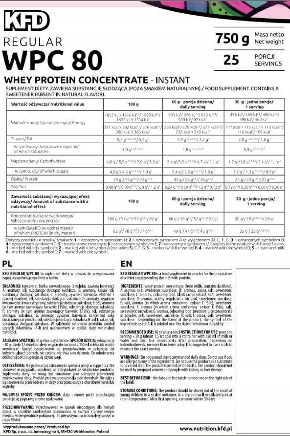 KFD Regular WPC 80 to w 100% czysty koncentrat białka serwatkowego. Produkt cechuje się dobrą rozpuszczalnością i delikatnym smakiem. Został stworzony przy wykorzystaniu procesu ultrafiltracji , co umożliwia uzyskanie produktu wyróżniającego się niską zawartością tłuszczów i laktozy.