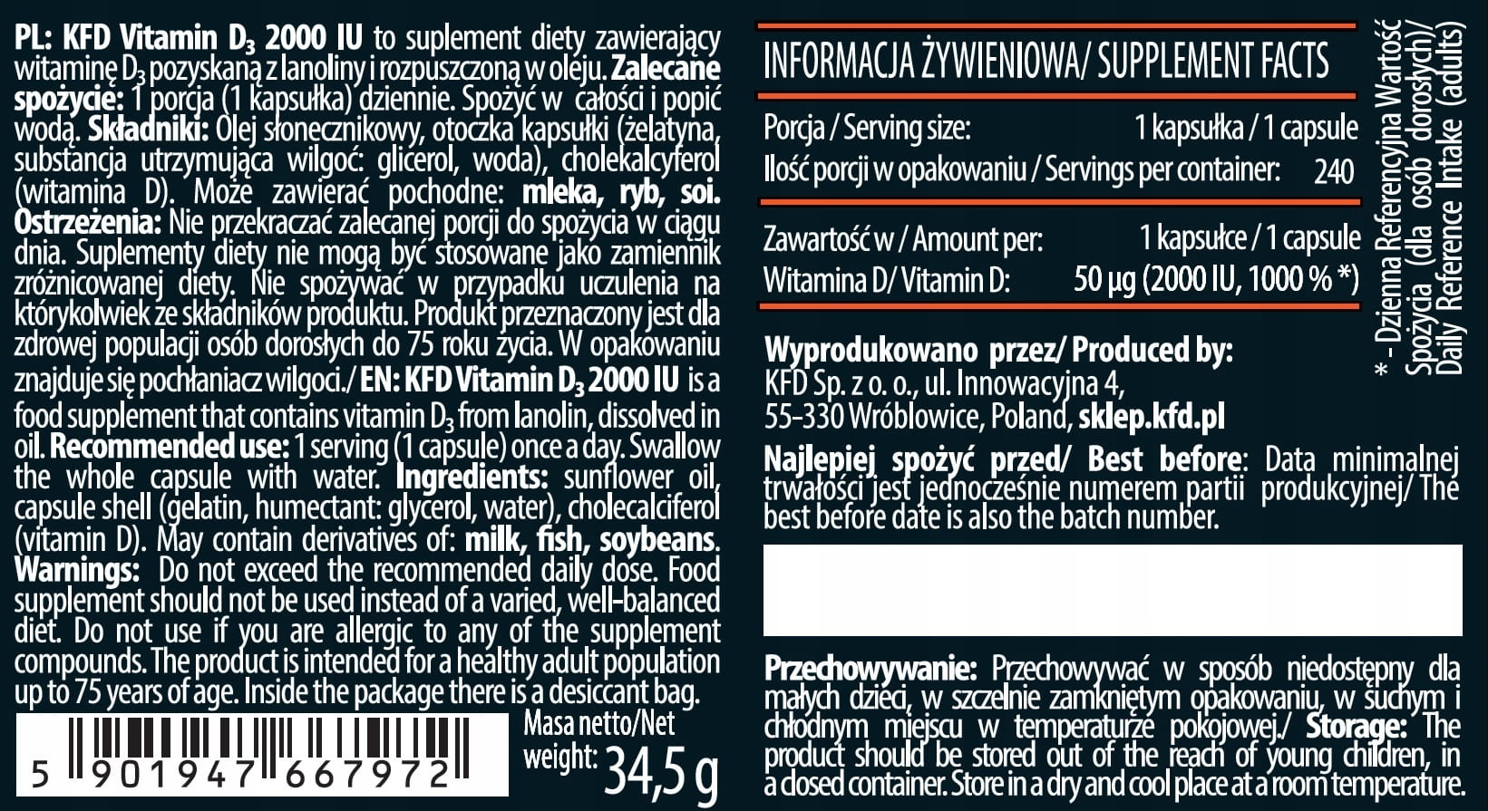 KFD Vitamin D3 2000 IU jest doskonałym wyborem dla osób, którym zależy na stałej i długotrwałej suplementacji witaminą D3 w celu zniwelowania ewentualnych niedoborów.