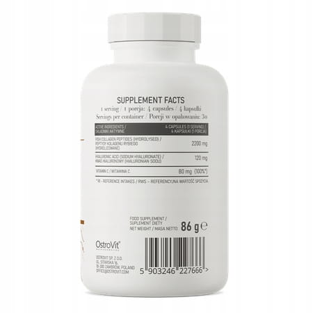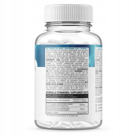 Składniki: Kolagen rybi, kwas hialuronowy (hialuronian sodu), kwas L-askorbinowy (witamina C), otoczka kapsułki (substancja wypełniająca: hydroksypropylometyloceluloza).