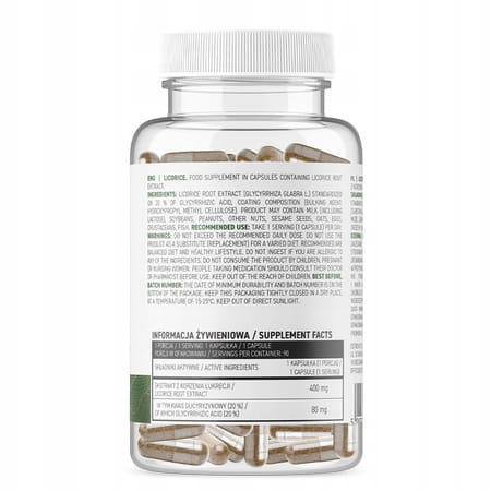 Składniki: Ekstrakt z korzenia lukrecji (Glycyrrhiza glabra L.) standaryzowany na 20% kwas glicyryzynowego, otoczka kapsułki (substancja wypełniająca: hydroksypropylometyloceluloza).