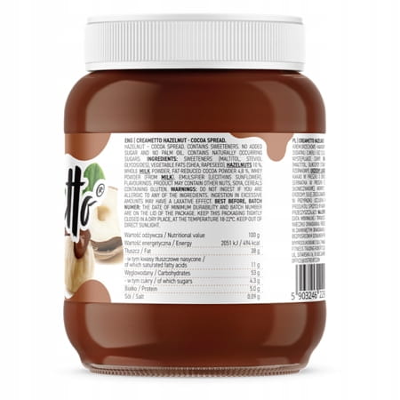 Wśród składników OstroVit Creametto 350 g znajdziesz m.in. zdrowe tłuszcze roślinne i węglowodany, natomiast substancję słodzącą stanowi maltitol, który cechuje się o połowę niższą kalorycznością niż cukier i wyróżnia się niskim indeksem glikemicznym.