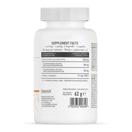 Dzienna porcja suplementu OstroVit Omega 3 EASY TO SWALLOW to aż 1000 mg oleju rybiego, w tym 180 mg kwas eikozapentaenowego EPA i 120 mg kwas dokozaheksaenowego DHA oraz 9,1 mg rozpuszczalnej w tłuszczach witaminy E.