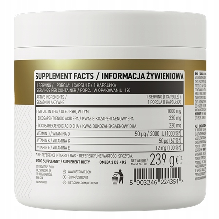 KWASY TŁUSZCZOWE OSTROVIT OMEGA 3 D3+K2 330 EPA 220 DHA 180 CAPS