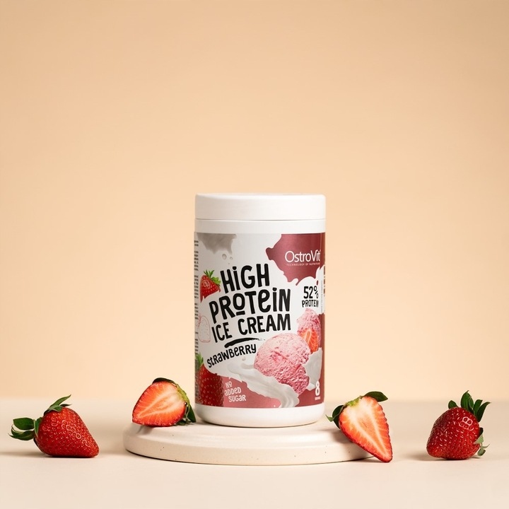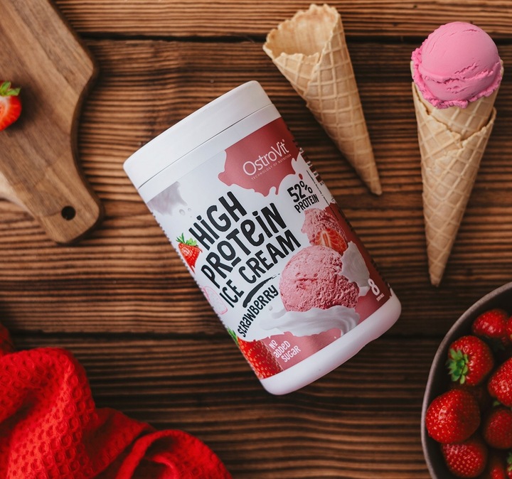 Postaw na nasz rewolucyjny produkt – OstroVit Lody wysokobiałkowe o smaku truskawkowym.