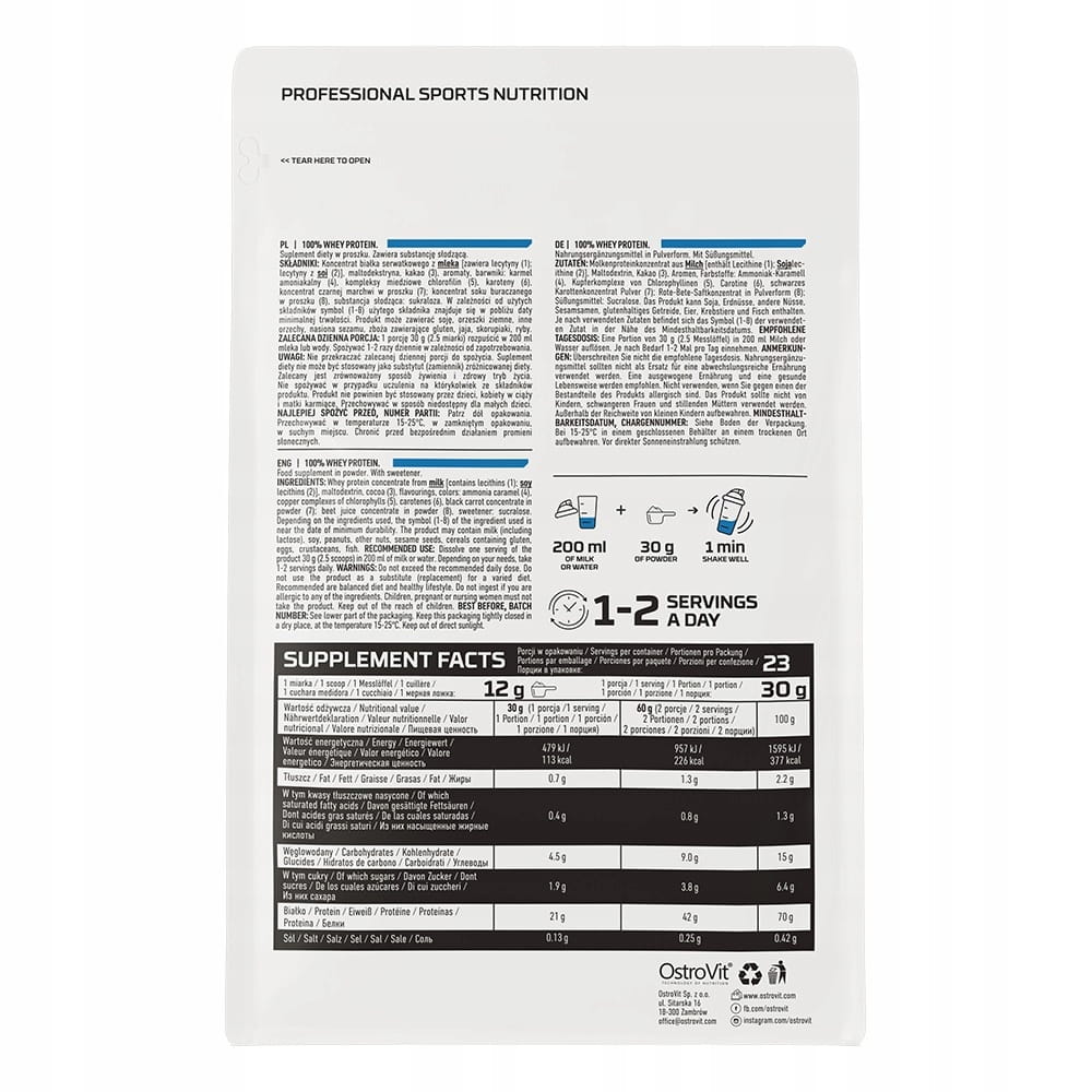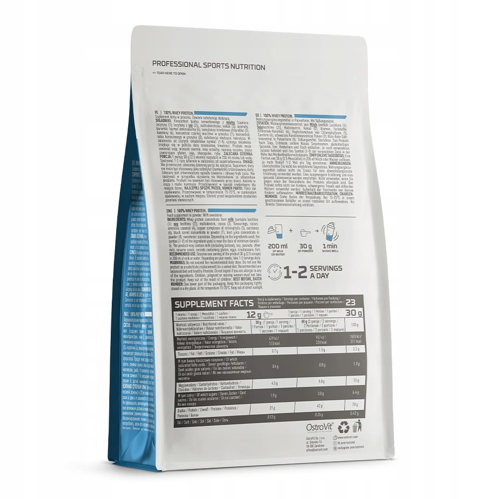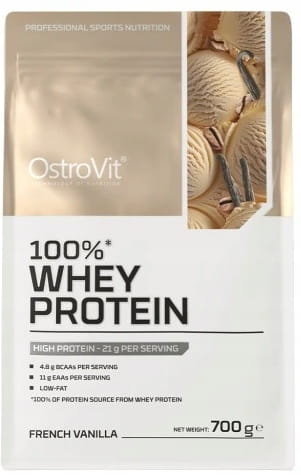 OstroVit 100 % WHEY PROTEIN to najwyższej jakości odżywka białkowa zawierająca 70% protein. Ten suplement diety jest odpowiedni dla wszystkich sportowców, niezależnie od uprawianej dyscypliny sportowej. Szczególnie polecany jest w okresie budowania masy mięśniowej jak i redukcji tkanki tłuszczowej. Może być stosowany w czasie zaawansowanych treningów, ale również jako składnik codziennej diety, w celu uzupełnienia wartości odżywczych.
