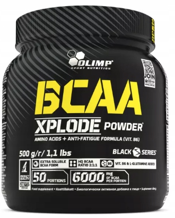 Olimp BCAA Xplode Powder® - suplement diety w proszku, zawierający kompleks aminokwasów rozgałęzionych, L-glutaminę oraz witaminę B6. Zawiera substancje słodzące.