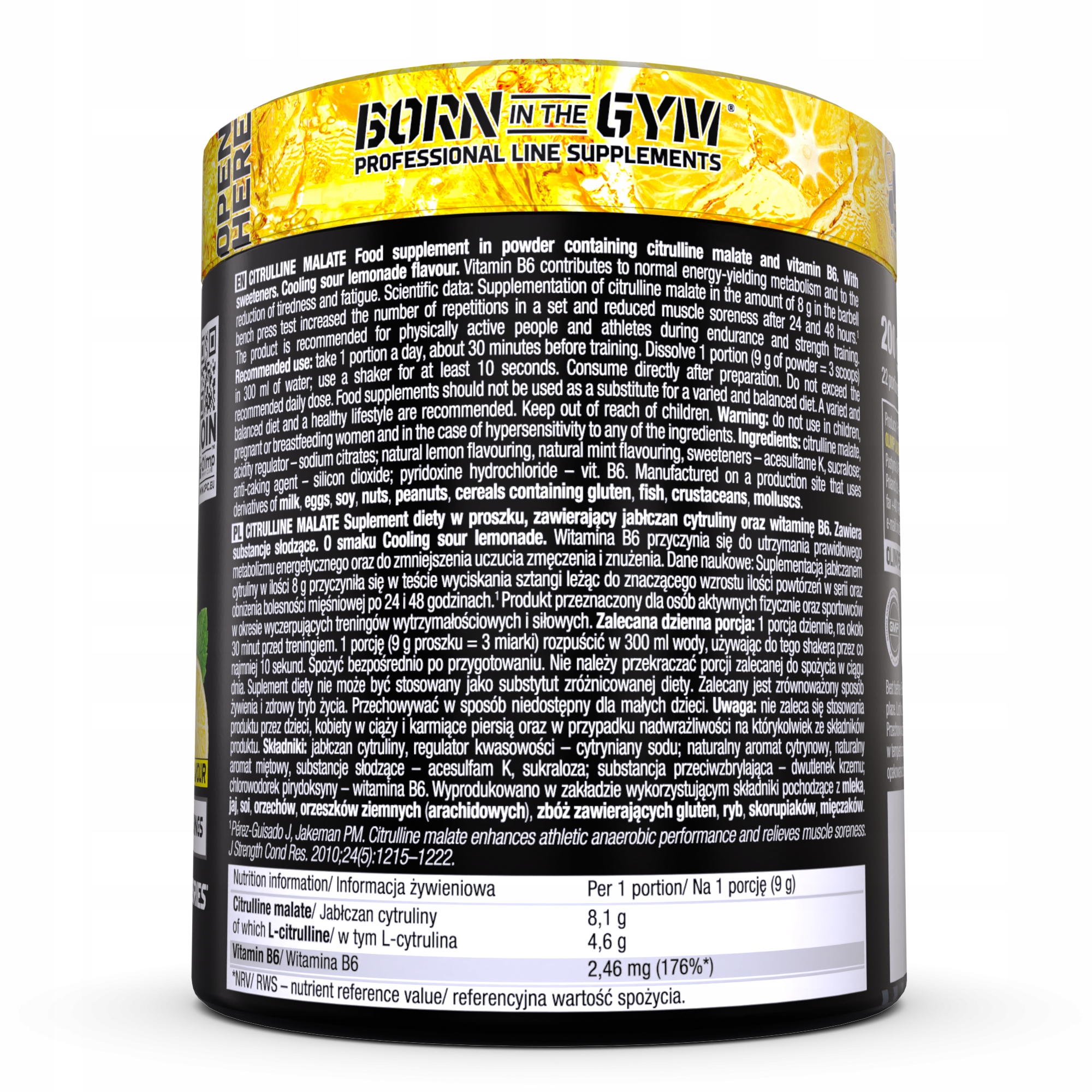 Składniki: jabłczan cytruliny, regulator kwasowości – cytryniany sodu; aromat, substancje słodzące – acesulfam K, sukraloza; substancja przeciwzbrylająca – dwutlenek krzemu; chlorowodorek pirydoksyny – witamina B6.