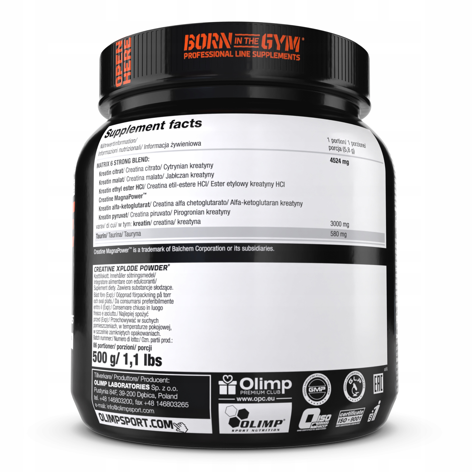 Doskonała kompozycja najbardziej zaawansowanych form kreatyny, charakteryzujących się najwyższą aktywnością anaboliczną i wzorem przemian energetycznych. Creatine Xplode™ to zestawienie w jednym, unikatowym, produkcie aż 6 najpopularniejszych i najbardziej skutecznych form kreatyn, stosowanych obecnie na świecie w zaawansowanej suplementacji sportowców. Skład tego szczególnego produktu został odpowiednio wyważony, tak, aby uwalnianie swobodnych cząsteczek kreatyny było największe zaraz po spożyciu Creatine Xplode™ bardzo szybko pokrywając zapotrzebowanie organizmu na ten związek, w stanach jego największego narażenia na katabolizm, czyli po przebudzeniu i zaraz po treningu. W skład tego skutecznego produktu wchodzą takie formy kreatyny jak jabłczan, ester etylowy, alfa-ketoglutaran, pirogronian, cytrynian oraz prawdziwa "perełka" w tej grupie - doskonały chelat kreatynowy magnezu (Creatine Magna Power). Użycie tych wysokowydajnych form kreatyn gwarantuje osiągnięcie nie tylko, wspomnianej już, maksymalnie zróżnicowanej kinetyki uwalniania wolnej cząsteczki kreatyny, a także minimalnych strat tej substancji (przemiana do nieaktywnej kreatyniny) w niesprzyjających warunkach środowiska przewodu pokarmowego. Nie bez znaczenia pozostaje fakt, iż użyte metabolity energetyczne kreatyny (pirogronian, jabłczan czy alfa-ketoglutaran), po uwolnieniu jej wolnej cząsteczki, zasilają pulę związków wchodzących w cykl przemian energetycznych organizmu (m.in. cykl Krebsa), bezpośrednio wpływając na obniżenie subiektywnego uczucia zmęczenia sportowca. Bardzo skutecznie pomaga w tym również wzbogacenie Creatine Xplode™ o taurynę, która działając synergistycznie potrafi bardzo efektywnie wpłynąć na zwiększenie objętości treningu, wyraźnie przyczyniając się do poprawy osiągów sportowych, skracając jednocześnie czas regeneracji potreningowej. Wszystkie przytoczone fakty bezsprzecznie stawiają najnowszy produkt OLIMP na pozycji lidera w porównaniu z tradycyjnymi, jednoskładnikowymi suplementami kreatyny.