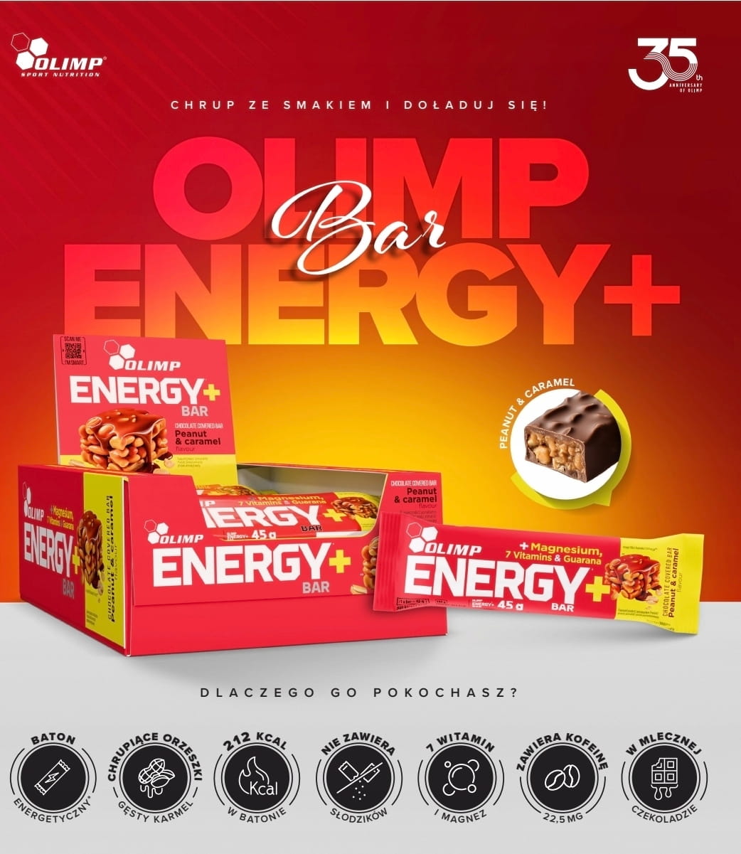 OLIMP ENERGY+ BAR 45 g BATON PROTEINOWY BIAŁKO WITAMINY MAGNEZ KOFEINA