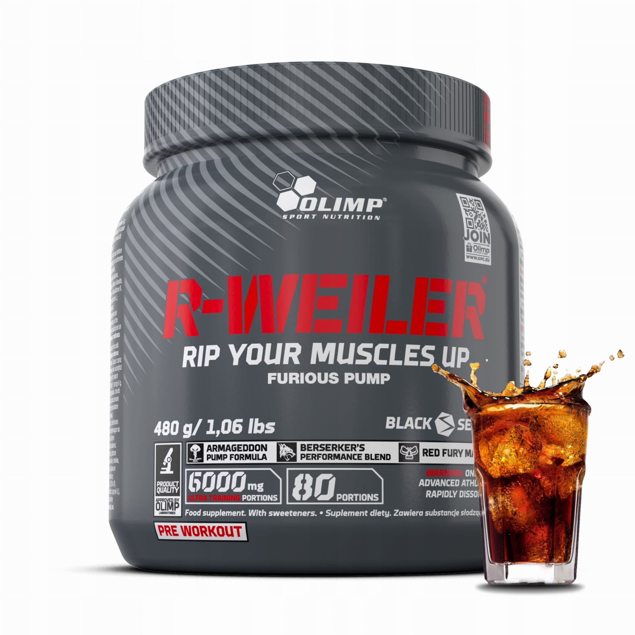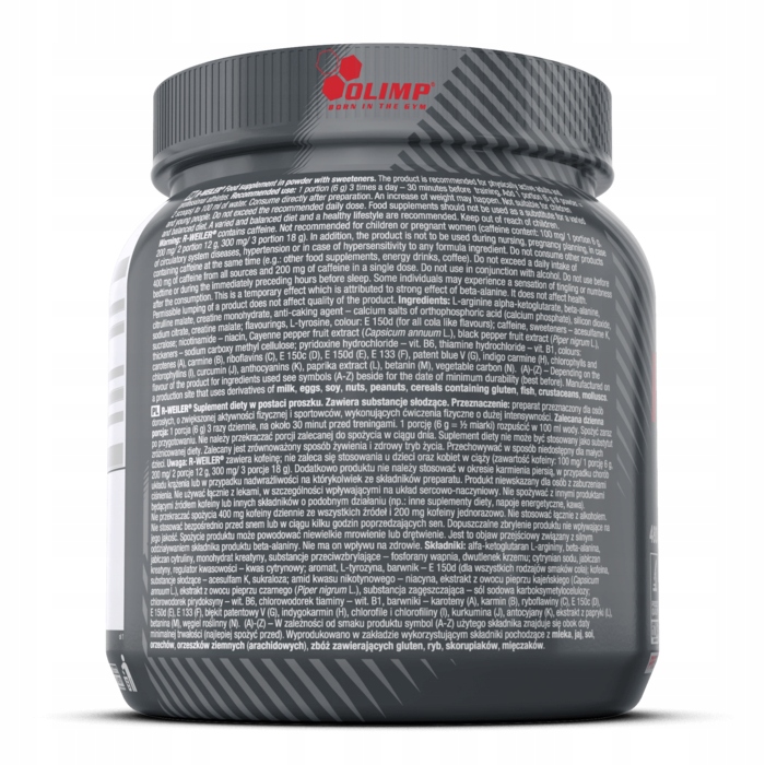 Uwaga: Olimp R-WEILER® zawiera kofeinę; nie zaleca się stosowania u dzieci oraz kobiet w ciąży (zawartość kofeiny: 100 mg/ 1 porcje 6 g, 200 mg/ 2 porcje 12 g, 300 mg/ 3 porcje 18 g). Dodatkowo produktu nie należy stosować w okresie karmienia piersią, w przypadku chorób układu krążenia lub w przypadku nadwrażliwości na którykolwiek ze składników preparatu. Produkt niewskazany dla osób z zaburzeniami ciśnienia. Nie używać łącznie z lekami, w szczególności wpływającymi na układ sercowo-naczyniowy. Nie spożywać z innymi produktami będącymi źródłem kofeiny lub innych składników o podobnym działaniu (np.: inne suplementy diety, napoje energetyczne, kawa). Nie przekraczać spożycia 400 mg kofeiny dziennie ze wszystkich źródeł i 200 mg kofeiny jednorazowo. Nie stosować łącznie z alkoholem. Nie stosować bezpośrednio przed snem lub w ciągu kilku godzin poprzedzających sen. Spożycie produktu może powodować niewielkie mrowienie lub drętwienie. Jest to objaw przejściowy związany z silnym oddziaływaniem składnika produktu beta-alaniny. Nie ma on wpływu na zdrowie. Dopuszczalne zbrylenie i wytworzenie się osadu nie wpływające na jakość produktu.