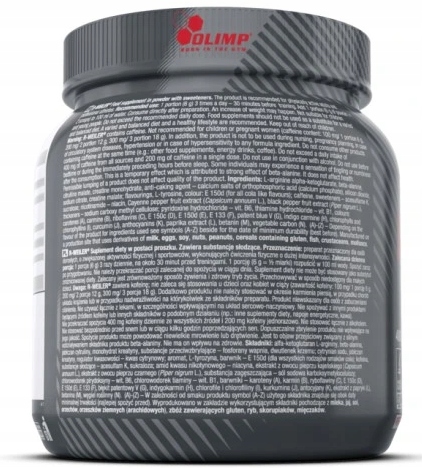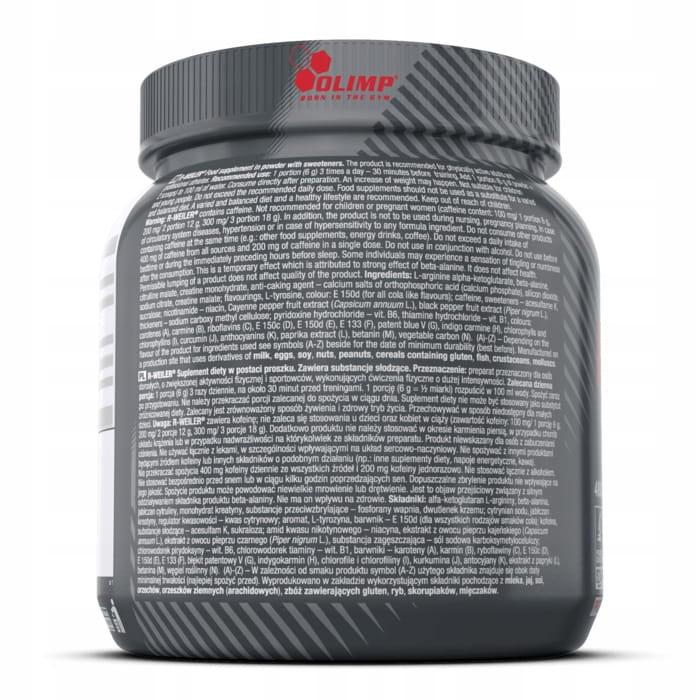 Uwaga: Olimp R-Weiler® zawiera kofeinę; nie zaleca się stosowania u dzieci oraz kobiet w ciąży (zawartość kofeiny: 100 mg/ 1 porcje 6 g, 200 mg/ 2 porcje 12 g, 300 mg/ 3 porcje 18 g). Dodatkowo produktu nie należy stosować w okresie karmienia piersią, w przypadku chorób układu krążenia lub w przypadku nadwrażliwości na którykolwiek ze składników preparatu. Produkt niewskazany dla osób z zaburzeniami ciśnienia. Nie używać łącznie z lekami, w szczególności wpływającymi na układ sercowo-naczyniowy. Nie spożywać z innymi produktami będącymi źródłem kofeiny lub innych składników o podobnym działaniu (np.: inne suplementy diety, napoje energetyczne, kawa). Nie przekraczać spożycia 400 mg kofeiny dziennie ze wszystkich źródeł i 200 mg kofeiny jednorazowo. Nie stosować łącznie z alkoholem. Nie stosować bezpośrednio przed snem lub w ciągu kilku godzin poprzedzających sen. Spożycie produktu może powodować niewielkie mrowienie lub drętwienie. Jest to objaw przejściowy związany z silnym oddziaływaniem składnika produktu beta-alaniny. Nie ma on wpływu na zdrowie. Dopuszczalne zbrylenie produktu nie wpływające na jego jakość.