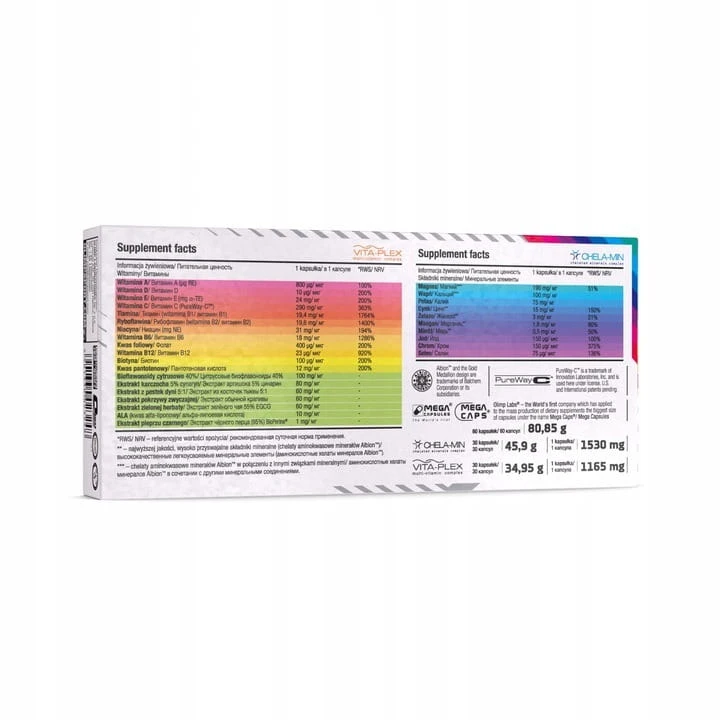 Vita-Min Multiple Sport – kompleksowe wsparcie dla każdego sportowcaIntensywny trening sprzyja rozwojowi sylwetki. Nie mniej jednak, wysiłek fizyczny generuje również straty w naszym organizmie. Tracimy m.in. cenne witaminy i minerały, których niedobór warto uzupełnić w codziennej diecie. Skutecznym sposobem jest suplementacja, w tym wypadku witaminowo-mineralnym kompleksem od Olimp Sport Nutrition – Vita-Min Multiple Sport wzbogaconym dodatkowo naturalnymi ekstraktami roślinnymi. Vita-Min Multiple Sport to dwie łatwe do połknięcia kapsułki, w których specjaliści Olimp Laboratories zamknęli kluczowe dla prawidłowego funkcjonowania organizmu mikroelementy. W białej kapsułce VITA – PLEX SPORT® znajdziemy szereg cennych witamin (A, C, D, E i grupy B) wspartych naturalnymi, bezpiecznymi w stosowaniu ekstraktami roślinnymi (bioflawonoidy cytrusowe, karczoch, zielona herbata, kwas ALA oraz piperyna), wzmacniającymi działanie suplementu diety. Niebieska kapsułka CHELA-MIN SPORT® natomiast zawiera niezbędne składniki mineralne (m.in. magnez, wapń, potas, cynk, żelazo), które występują w formie wysoko przyswajalnych chelatów aminokwasowych Albion. |