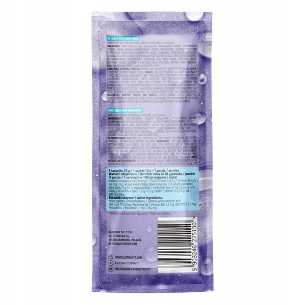 OstroVit Aqua Kick Good Night to suplement diety zapewniający zdrowy i mocny sen. Dzięki unikalnemu połączeniu neuroprzekaźnika GABA, witaminy B6 oraz melatoniny środek zmniejsza wieczorną pobudliwość neuronów, dzięki czemu wycisza, przyspiesza zasypianie i zmniejsza liczbę nocnych pobudek. Jeżeli Ty również potrzebujesz dużo czasu, by zasnąć, często budzisz się w nocy lub odczuwasz ciągłe niewyspanie, wypróbuj saszetki Aqua Kick Good Night o orzeźwiającym smaku czarnej porzeczki.