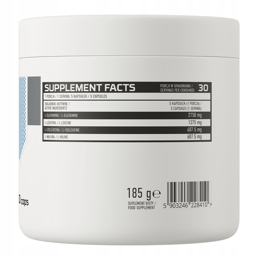 Składniki: L-glutamina, L-leucyna, L-izoleucyna, L-walina, otoczka kapsułki (żelatyna, woda oczyszczona).