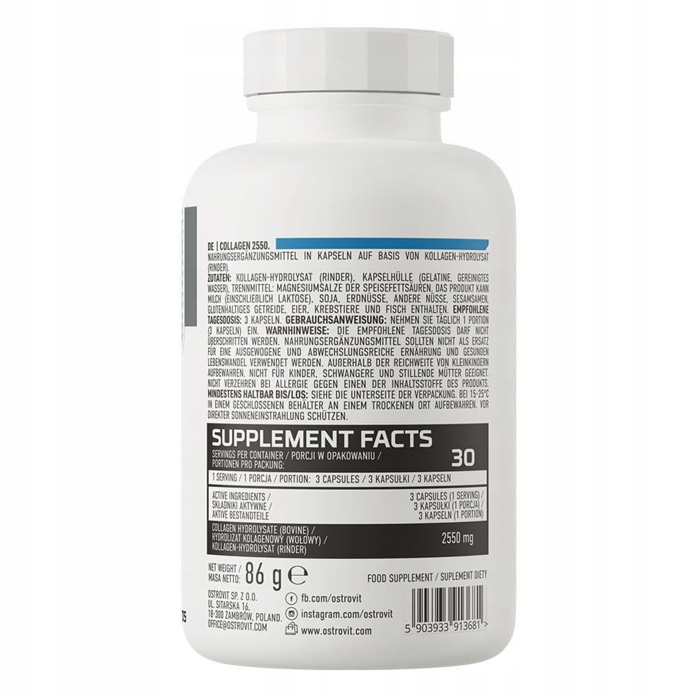 OstroVit Kolagen 2550 mg to wysokiej jakości suplement diety, który zawiera hydrolizat kolagenu wołowego. To preparat dostępny w postaci łatwych do połknięcia kapsułek, który rekomendowany jest w szczególności wśród sportowców oraz osób, którym zależy na zdrowym i pięknym wyglądzie.