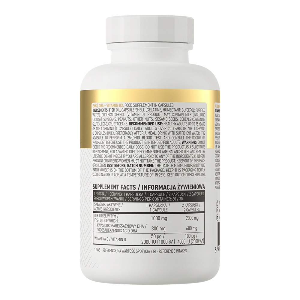✅ Źródło DHA i Witaminy D3 - jedna porcja suplementu diety dostarcza do organizmu 50 ug cholekalcyferolu oraz 1000 mg oleju rybiego, który zawiera 300 mg kwasu dokozaheksaenowego.