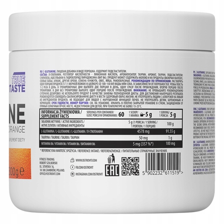 Składniki: L-glutamina, regulator kwasowości – kwas cytrynowy, aromat, tauryna, substancje słodzące: sukraloza, acesulfam K; chlorowodorek pirydoksyny (wit. B6).