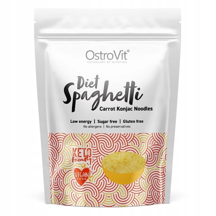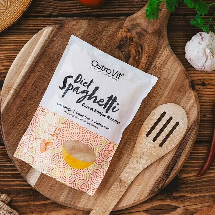 ⭐️ OstroVit Diet Spaghetti Carrot Konjac Noodles ⭐️ to niskokaloryczny odpowiednik klasycznego makaronu spaghetti. Produkt został wyprodukowany z mąki konjac oraz sproszkowanej marchewki. Makaron jest w pełni bezglutenowy, a w składzie nie zawiera dodatku cukru. Charakteryzuje się niskim indeksem glikemicznym, a także niewielką zawartością tłuszczu. Poszukujesz smacznej alternatywy dla klasycznego pszennego makaronu? Koniecznie przetestuj OstroVit Diet Spaghetti Carrot Konjac Noodles!