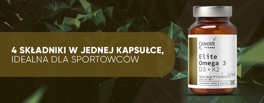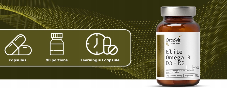 OstroVit Pharma Elite Omega 3 D3 + K2 to najwyższej jakości suplement diety w kapsułkach typu softgel opracowany na bazie oleju rybnego stanowiącego doskonałe źródło wielonienasyconych kwasów tłuszczowych omega 3 (EPA i DHA) oraz bogactwa witamin: D3 w postaci cholekalcyferolu, K2 menachinonu-7 oraz D-alfa-tokoferolu (witamina E).