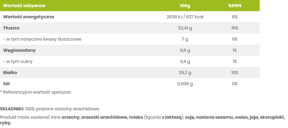 OstroVit 100% Peanut Butter jest w 100% wytwarzane z orzeszków ziemnych. Nie zawiera soli, cukru i oleju palmowego.