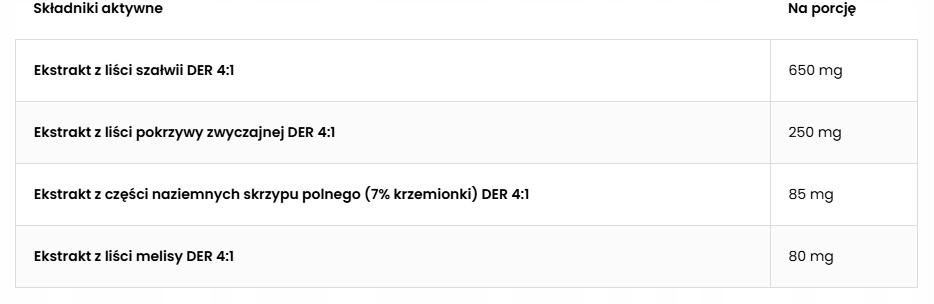 ✅ Źródło czterech ekstraktów roślinnych - jedna porcja suplementu diety dostarcza do organizmu 650 mg ekstraktu z liści szałwii DER 4:1, 85 mg ekstraktu z naziemnych części skrzypu polnego DER 4:1 zawierającego 7% krzemionki, a także 250 mg ekstraktu z liści pokrzywy zwyczajnej DER 4:1 i 80 mg ekstraktu z liści melisy DER 4:1.