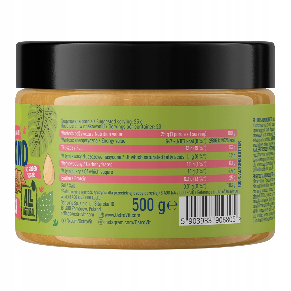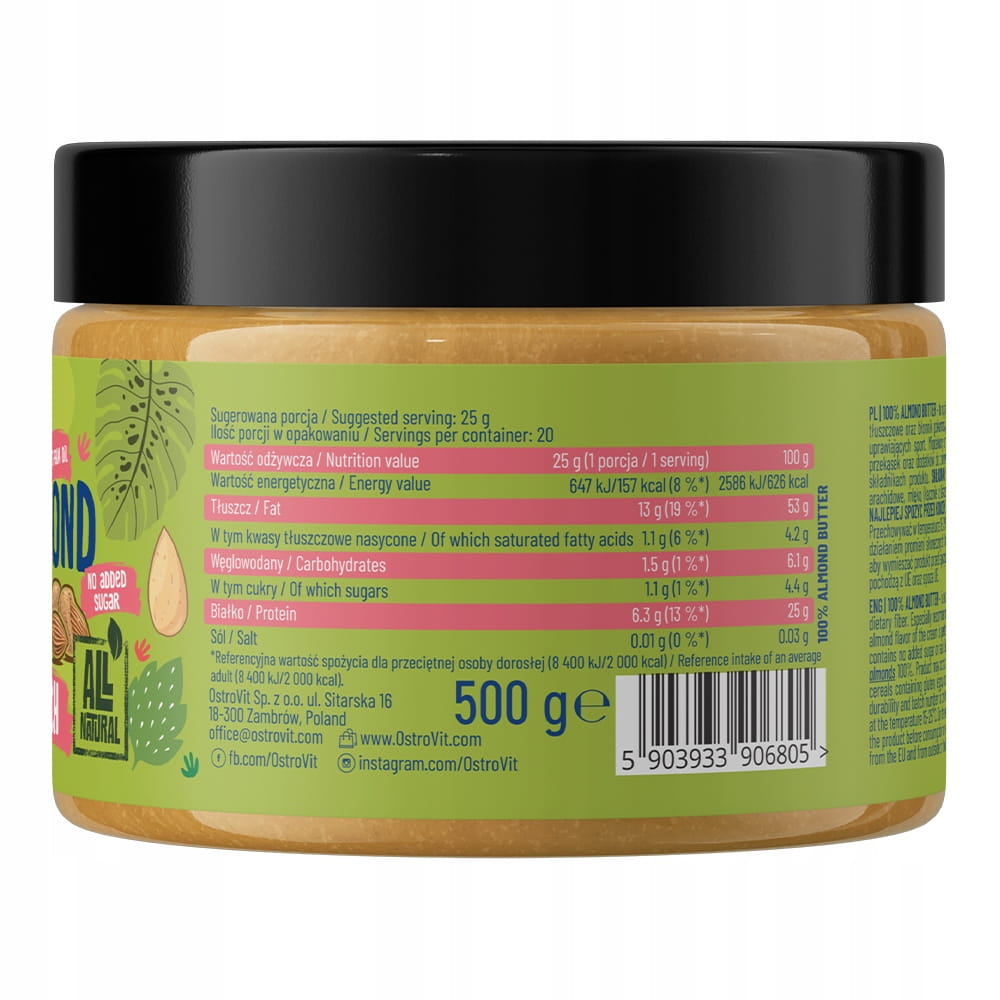 OstroVit 100% Krem Migdałowy to produkt o jednolitej i aksamitnej konsystencji, który sprawdzi się zarówno jako dodatek do dań na słodko, jak i na wytrawnie. To nietuzinkowe uzupełnienie diety sportowców, a także osób dbających o szczupłą sylwetkę, które nie zawiera zbędnych składników i wolne jest od dodatku cukru oraz soli.