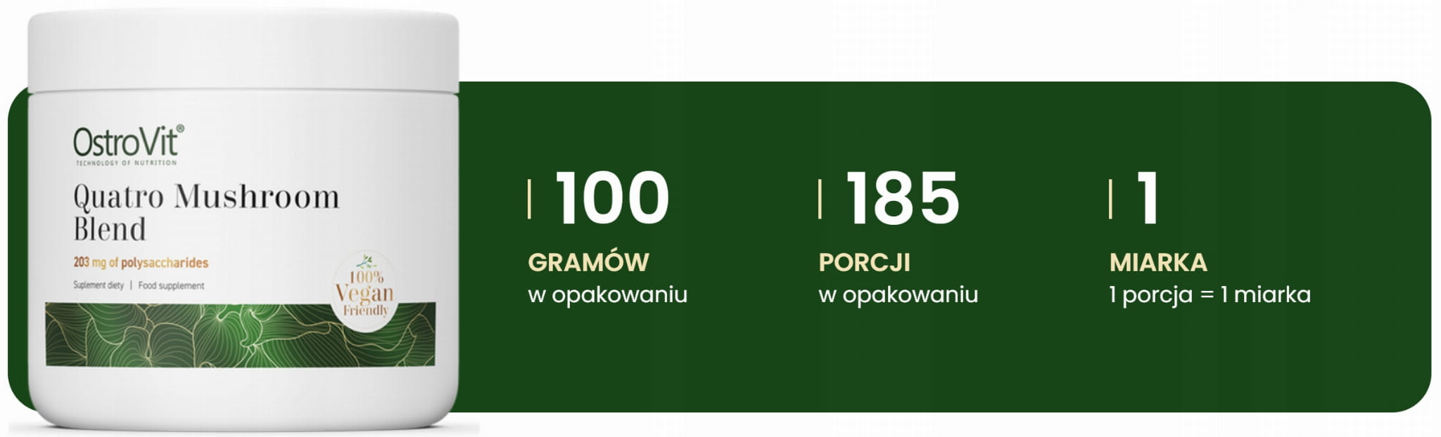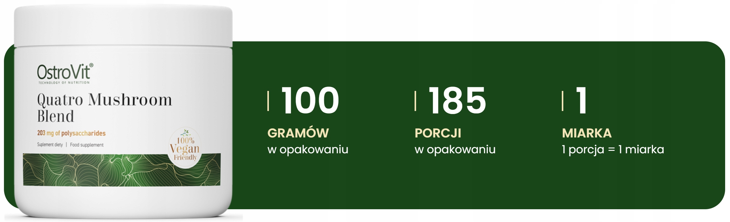 OstroVit Quatro Mushroom Blend VEGE to unikalne połączenie ekstraktów z czterech różnych grzybów -