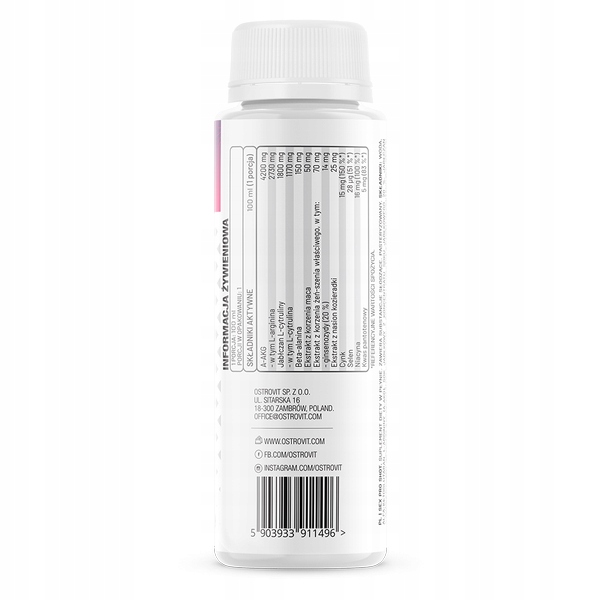 Składniki: Woda, alfa-ketoglutaran L-argininy (A-AKG), sok jabłkowy z koncentratu soku jabłkowego 20 %, jabłczan L-cytruliny, aromaty, beta-alanina, ekstrakt z korzenia żeń-szenia właściwego (Panax ginseng C.A. Meyer) standaryzowany na 20 % ginsenozydów, pikolinian cynku (cynk), substancje konserwujące: sorbinian potasu, benzoesan sodu; ekstrakt z korzenia maca (Lepidium meyenii Walp.), ekstrakt z nasion kozieradki (Trigonella foenum-graecum L.) DER 4:1, substancje słodzące: sukraloza, acesulfam K; heksanikotynian inozytolu (niacyna), L-selenometionina (selen), D-pantotenian wapnia (kwas pantotenowy).