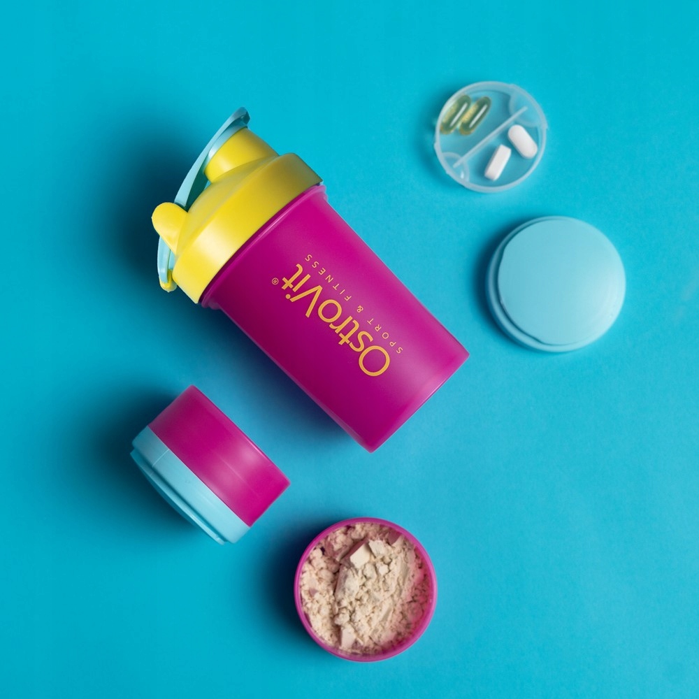 OstroVit Shaker Premium to wyjątkowy shaker, w którym przygotujesz swoje ulubione odżywki, bez których nie utrzymasz swojej diety w ryzach, a dodatkowo dzięki pilbox znajdującego się pod spodem pojemnika, zabierzesz ze sobą na trening suplementy w kapsułkach i tabletkach.