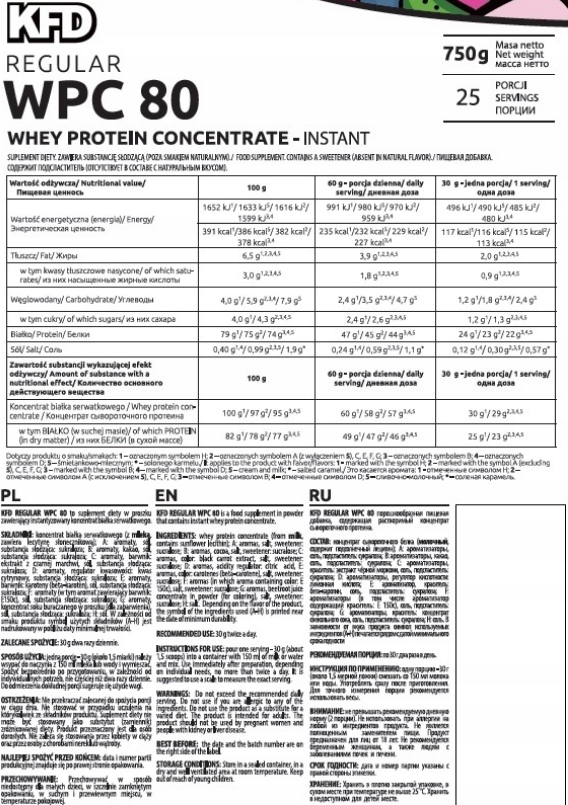 KFD Premium WPC 80 Creme Brulee to wysokiej jakości odżywka białkowa. Jest oparta na koncentracie białka serwatki i zawiera około 80% białka przy niewielkiej ilości tłuszczów i węglowodanów. Surowiec występuje w wersji instant, co oznacza bardzo dobrą rozpuszczalność. Białko KFD jest wolne od zbędnych dodatków, a rolę substancji słodzącej pełni sukraloza.