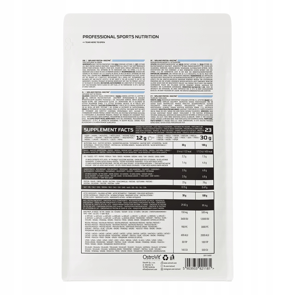Składniki: Koncentrat białek serwatkowych z mleka [zawiera lecytyny (1); lecytyny z soi (2)], kompleks multienzymatyczny DigeZyme®.