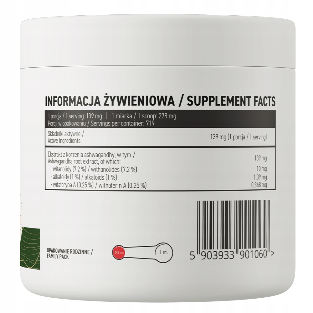 ✅ Źródło cennych substancji - jedna porcja suplementu diety dostarcza do organizmu 139 mg ekstraktu z korzenia ashwagandhy standaryzowanego na 7,2% witanolidów, 1% alkaloidów i 0,25% witaferyny A