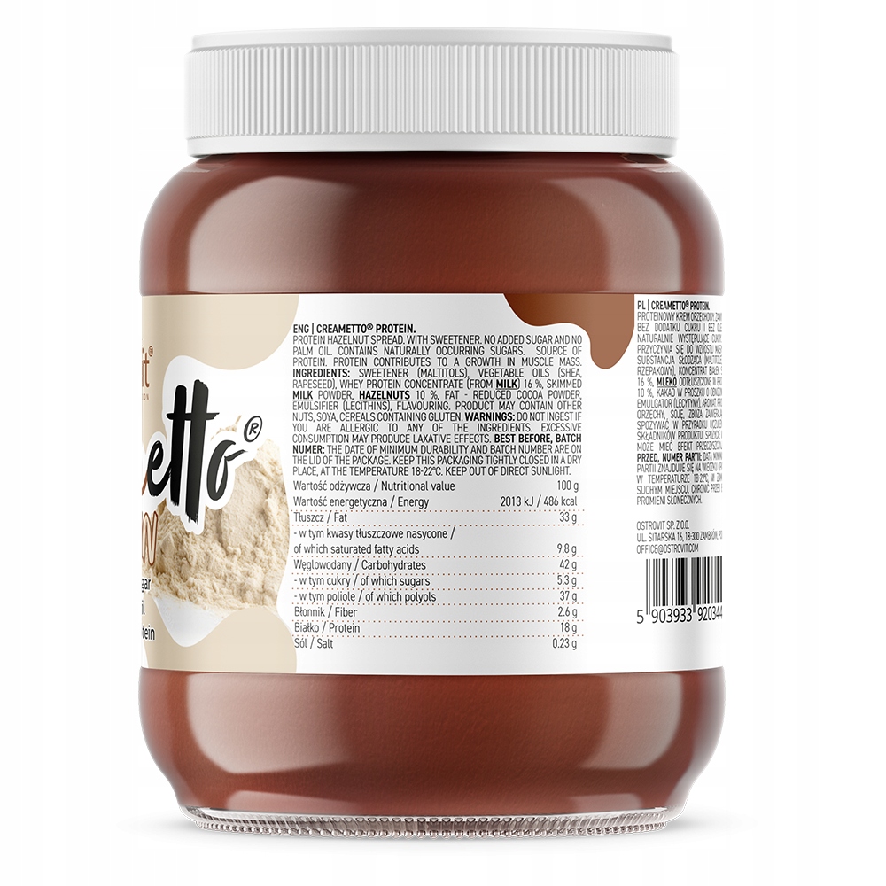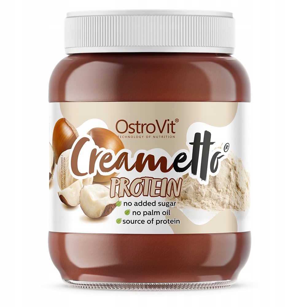 OstroVit Creametto Protein to proteinowy krem orzechowy, który stanowi słodką alternatywę dla wysokoenergetycznych produktów tego typu. To krem wyróżniający się bogactwem wysokiej jakości białka, a także zawartością cennych tłuszczów roślinnych i niskokalorycznej substancji słodzącej, jaką jest maltitol. To smaczny dodatek do dań, który doskonale sprawdzi się jako smarowidło do naleśników, urozmaicenie gofrów czy pasta do kanapek. OstroVit Creametto Protein można wykorzystać również podczas przygotowywania posiłków okołotreningowych oraz różnego rodzaju ciast i deserów.