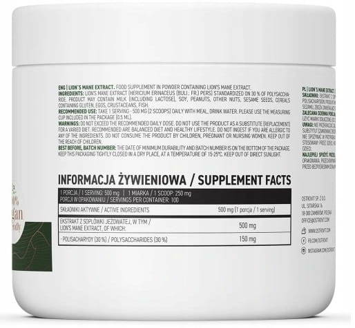 - Jedna porcja suplementu diety dostarcza do organizmu 500 mg ekstraktu z soplówki jeżowatej standaryzowanego na 30% polisacharydów.