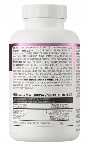Składniki: Olej sojowy, otoczka kapsułki: żelatyna, substancja utrzymująca wilgoć - glicerol, woda; bezzapachowy olej z czosnku (Allium sativum L.) DER 500:1.