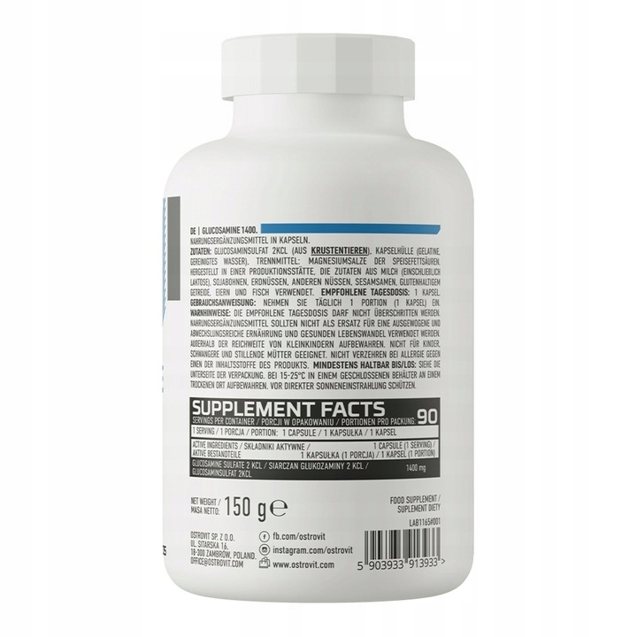 ⭐️ OstroVit Glukozamina 1400 mg 90 kapsułek ⭐️ to suplement diety w formie kapsułek, który stanowi źródło siarczanu glukozaminy - substancji, wyróżniającej się świetną wchłanialnością w ludzkim organizmie. To wysokiej jakości suplement diety, który rekomendowany jest w szczególności wśród sportowców i osób prowadzących aktywny tryb życia.