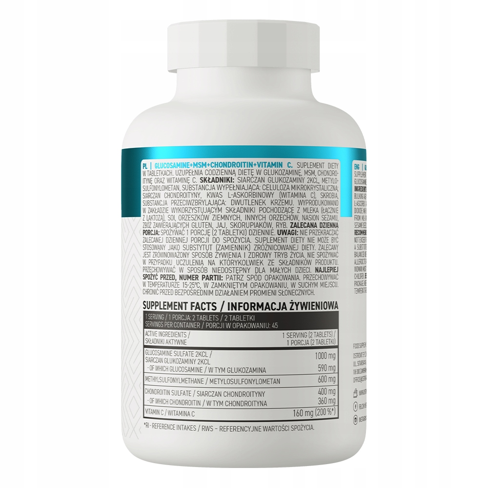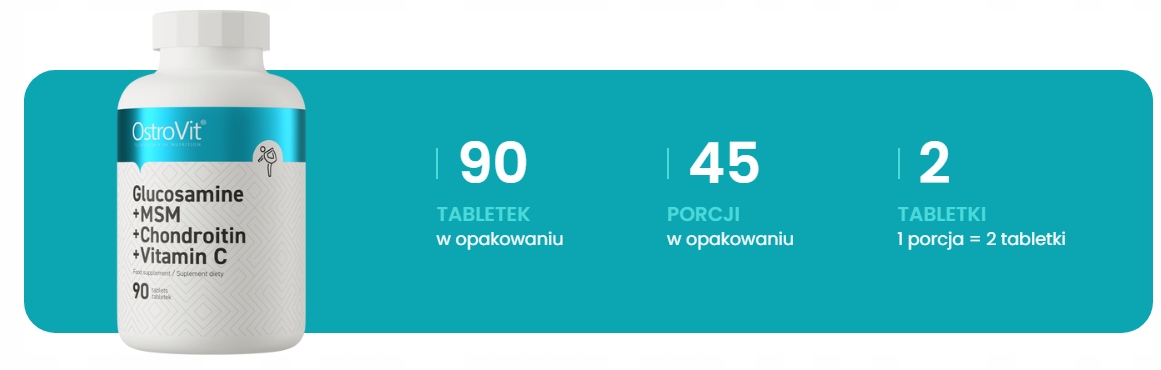 - Źródło wielu wartościowych związków - jedna porcja suplementu dostarcza do organizmu 1000 mg siarczanu glukozaminy, 600 mg metylosulfonylometanu, 400 mg siarczanu chondroityny oraz 160 mg witaminy C.