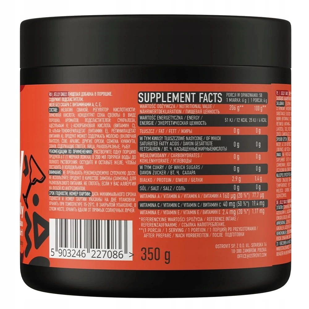 Galaretki to desery, które kocha każdy. Przypomnij sobie beztroskie dzieciństwo i przepyszne desery owocowe z galaretką, torty, ciasta i najrozmaitsze pyszności. Powiesz, że to prawdziwa bomba kaloryczna, a każdy kolejny taki deser to krok w tył w Twoich postępach o wymarzoną sylwetkę. To właśnie jest OstroVit Jelly Daily. Galaretki kompletne po, które sięgniesz w każdej chwili gdy tylko poczujesz głód. To galaretki, które zaspokoją Twoje najskrytsze potrzeby zjedzenia czegoś słodkiego bez wyrzutów sumienia. Z OstroVit Jelly Daily i jej pełnią smaku stworzysz najpyszniejsze desery, zjesz ją z owocami, lub przekąsisz deser kiedy podczas diety "redukcyjnej" najzwyczajniej w świecie będziesz miał ochotę zjeść coś smakowitego!