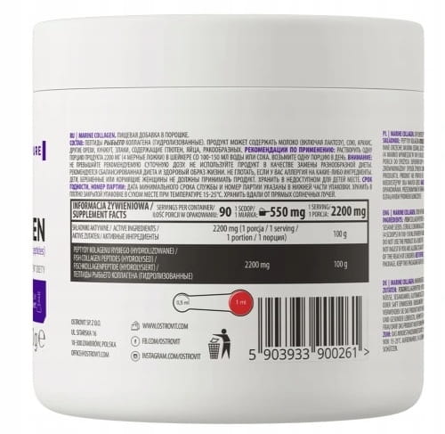Źródło kolagenu morskiego typu I - porcja preparatu zawiera 2200 mg hydrolizowanych peptydów kolagenu rybiego.