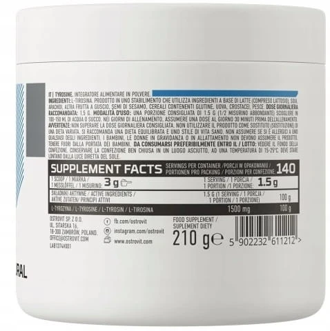 OstroVit Supreme Pure Tyrozyna to najwyższej klasy, zaawansowany preparat, którego jedynym składnikiem jest L-tyrozyna. Suplement został zaprojektowany w taki sposób, aby spełniać oczekiwania najbardziej wymagających konsumentów. Dzięki rozwiniętej technologii mikronizacji substancja została idealnie rozdrobniona.