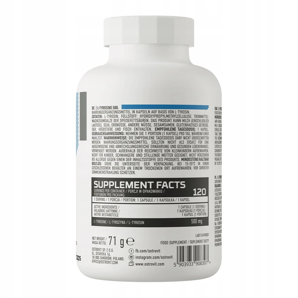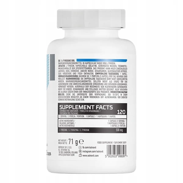 OstroVit L-Tyrosine to wysokiej jakości suplement diety w kapsułkach, składający się jedynie z jednej substancji - L-tyrozyny.